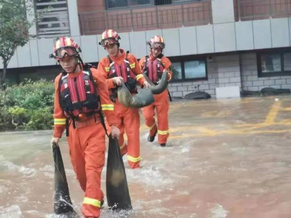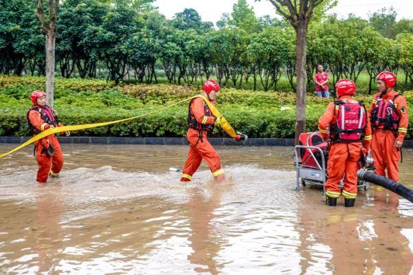 南京支隊22名指戰(zhàn)員于16時45分到達藥廠街8號鄭州高新梧桐水務(wù)有限公司門口街道,利用“龍吸水”大功率排澇車和移動供水泵組抽水排澇,被淹路段約1000米,最深處約1米。